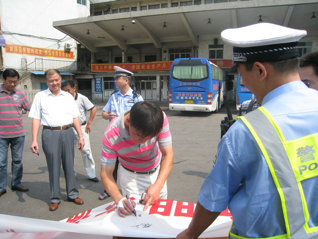 9月4日,市客運(yùn)分公司與交警支隊(duì)二大隊(duì)在安慶汽車站停車場(chǎng)內(nèi)開展“文明交通我承諾,文明交通我參與”駕駛員簽名活動(dòng);顒(dòng)首先由交警支隊(duì)二大隊(duì)二中隊(duì)楊指導(dǎo)員宣傳5種易發(fā)生道路交通事故的不良及違法駕駛行為,楊指要求駕駛員駕駛車輛做到:不超員、不超速、不疲勞駕駛、不酒后駕駛、不無(wú)證駕駛,做文明禮讓安全行車的文明駕駛員;隨后進(jìn)行了駕駛員簽名,市客運(yùn)分公司110名未當(dāng)班的駕駛員參加了本次簽名活動(dòng)。