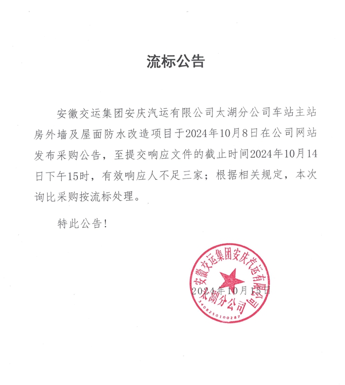 太湖分公司車站主站房外墻及屋面防水改造項目流標公告